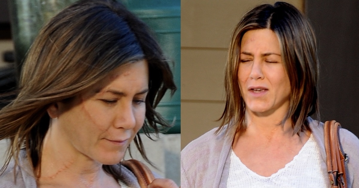 Jennifer Aniston Scar - Jennifer aniston is certainly looking rough and rugged on the set of her new movie.